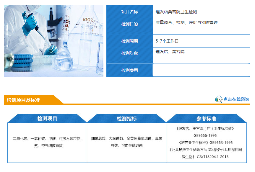 检测适合范围:各类理发店、美容院(店)的空气卫生标准值及其卫生要求。主要办理卫生许可证,可根据食药监局下发的批文进行检测。店内应有消毒设施或消毒间。正特、副特、甲、乙级烫发店、染发店和美容院应设有效的抽风设备,控制风速不低于0.3m/s。新开业的理发店、美容店营业面积必须在10平米以上。