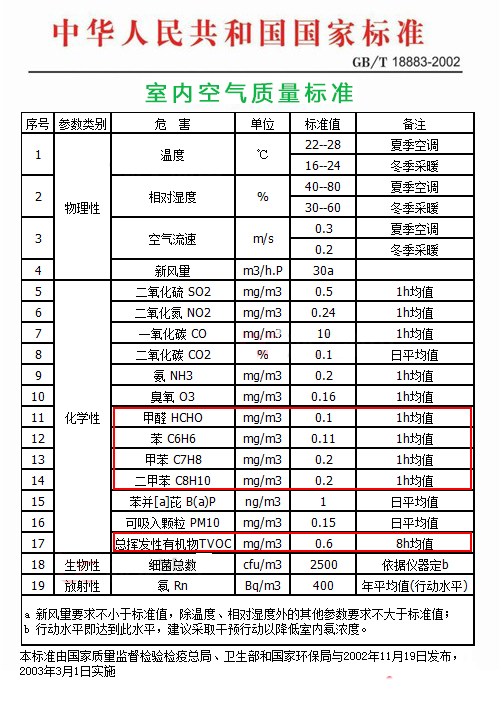 【1】《室内空气质量标准》(GB/T18883—2002):甲醛≤0.10,苯≤0.11,TVOC≤0.60;