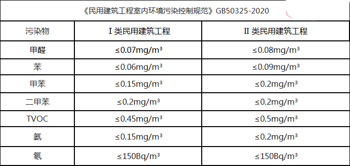备注:《民用建筑工程室内环境污染控制规范》GB50325-2020 标准为目前国家通用标准,若其它标准和此标准产生冲突,则以此标准为准。